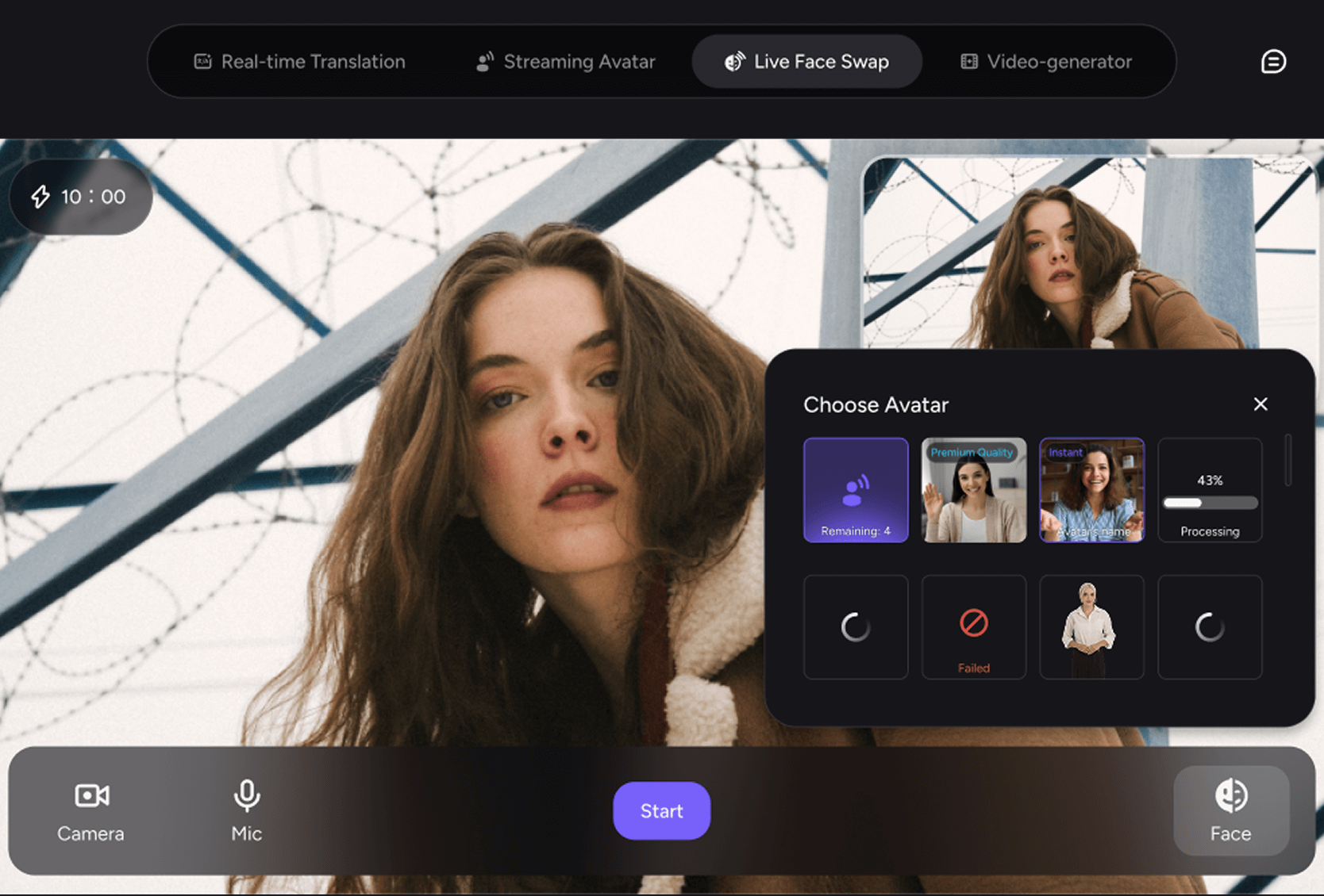 Core Functionality: Using camera input, the system replaces a user's live facial movements with a pre-selected target face (e.g., a celebrity, cartoon character, or custom template). The swapped output is streamed to recipients in real time.